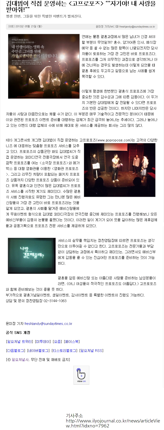 얼마전 프로포즈 하실때 오셔서 촬영해가시고 인터뷰 해가시더니
