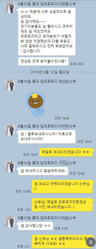고객카톡후기 19년8월10일 홍대 답프로포즈 신부님의 감동후기입니다 ^^
