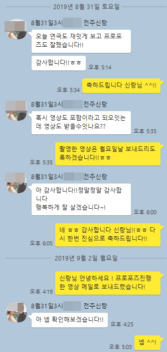 고객카톡후기 19년8월31일 전주프로포즈 신랑님의 감동후기입니다 ^^ 페이지 정보 작성자고프로포즈 댓글 0건 조회 4,267회 본문 연극도 너무 재밌게보고 프로포즈도 잘하셨다고 신랑님께서 말씀해주셔서 너무 기분좋았던 후기입니다 ^^고프로포즈는 신랑님들이 원하지않는이상에는 영상촬영을 항상해드려서 영상도 보내드려서신랑님이 너무 좋아하셨던 프로포즈였습니다 ^^ 검색 목록 0개의 댓글이 있습니다. 등록된 댓글이 없습니다.