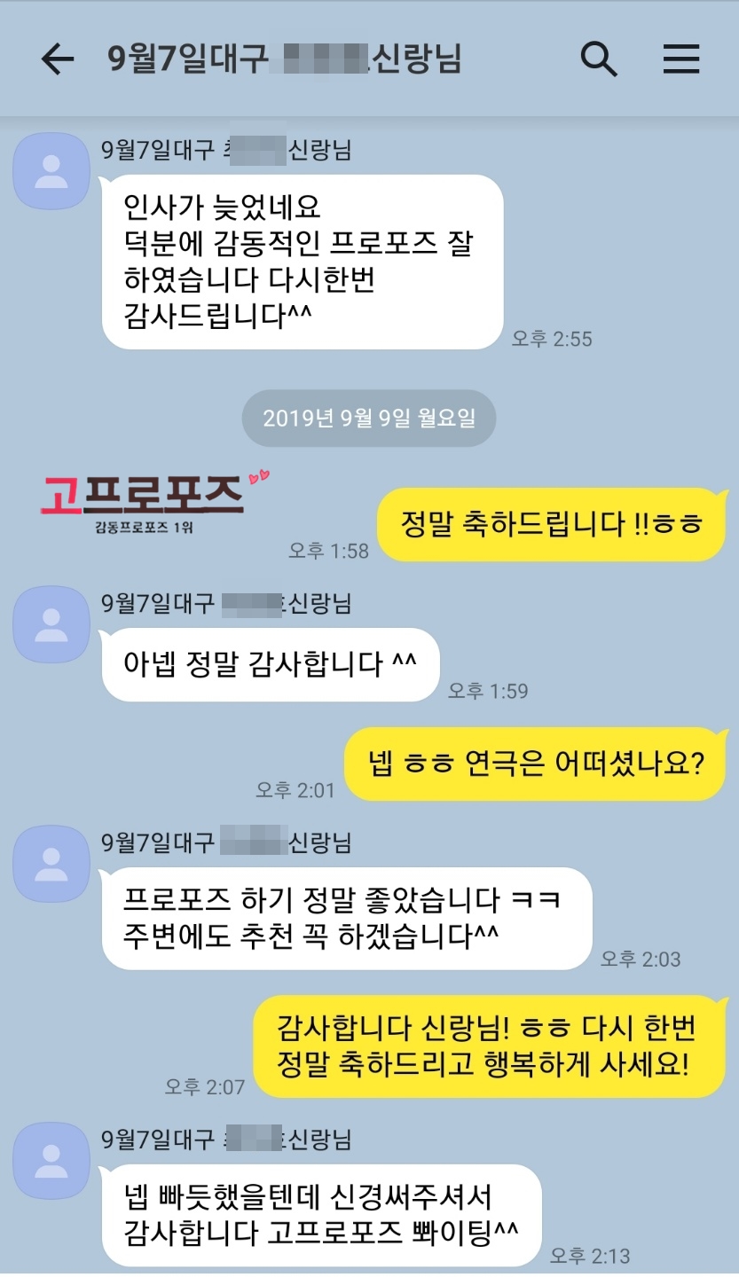 고객카톡후기 19년 9월7일 대구프로포즈 신랑님의 감동후기입니다^^