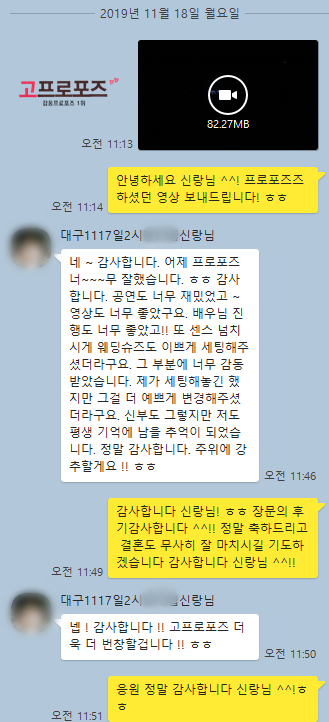 고객카톡후기 19년11월17일 대구극장프로포즈 신랑님의 감동후기입니다 ^^
