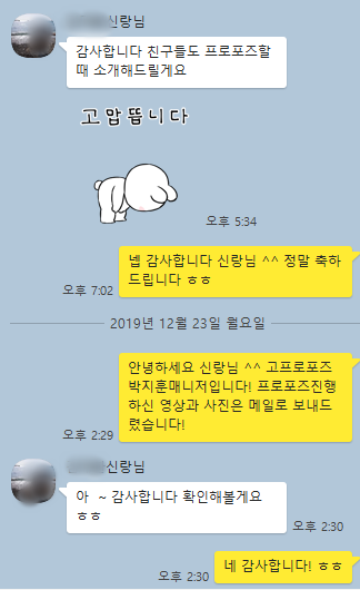 고객카톡후기 19년12월22일 인천영화관프로포즈 신랑님의 후기입니다 ^^